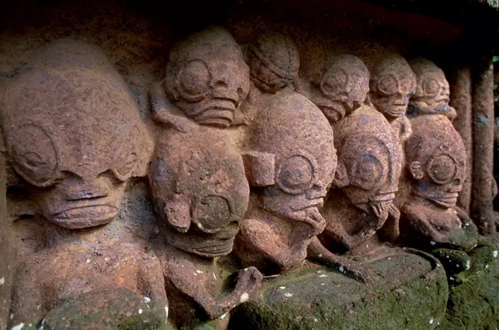 Статуи в местечке под названием Темехеа-Тохуа на Маркизских островах изображают странных существ, облик которых в массовом сознании связывается с инопланетянами. Они разные: есть крупные большеротые "рептилоиды", а есть и другие: с маленькими туловищами и непропорционально большими вытянутыми головами-шлемами с огромными глазами. Общее у них одно - злобное выражение лиц. Были ли это пришельцы из других миров или просто жрецы в масках - неизвестно. Статуи датируются примерно началом II тысячелетия.