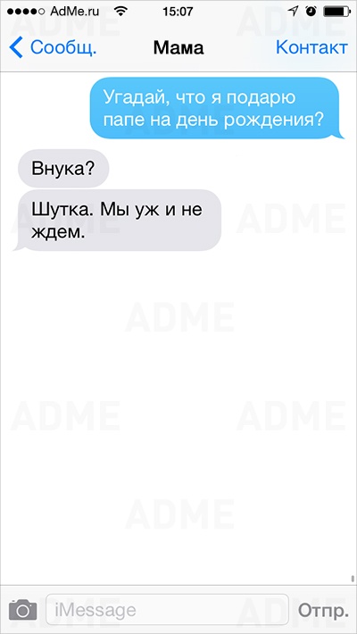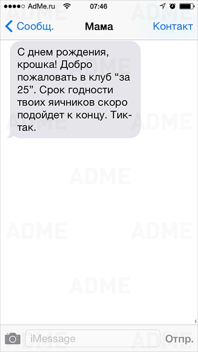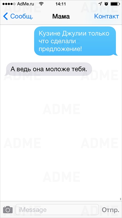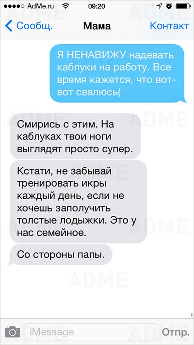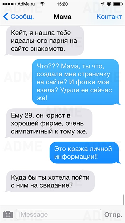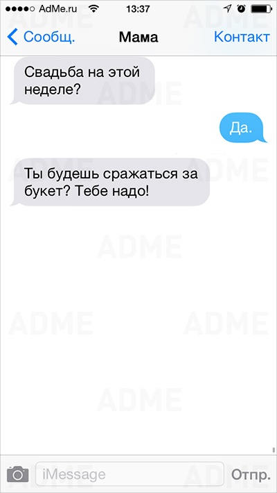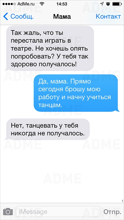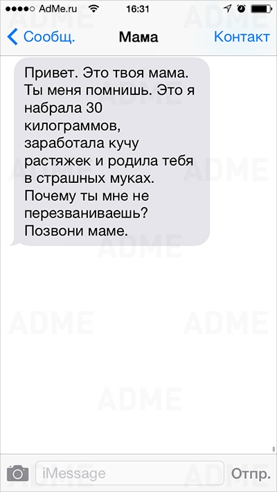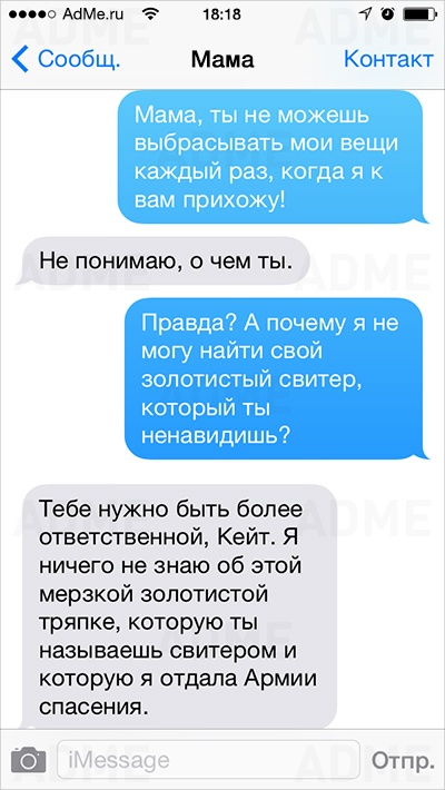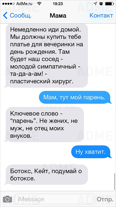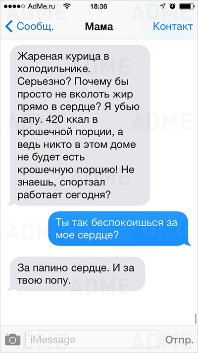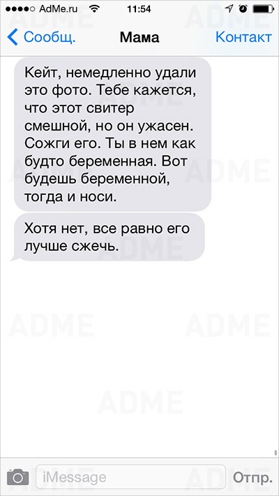 Американке Кейт Сигель повезло: ее мама не только любит давать советы и обладает отменным чувством юмора, но еще и обожает писать SMS. У Кейт накопилось столько шедевральных сообщений, что она начала выкладывать их в Instagram и Twitter, и ее мама сразу же обрела сотни тысяч поклонников. AdMe.ru перевел сообщения еврейской мамы Кейт и еще раз убедился: все-таки мамы одинаковы во всем мире.