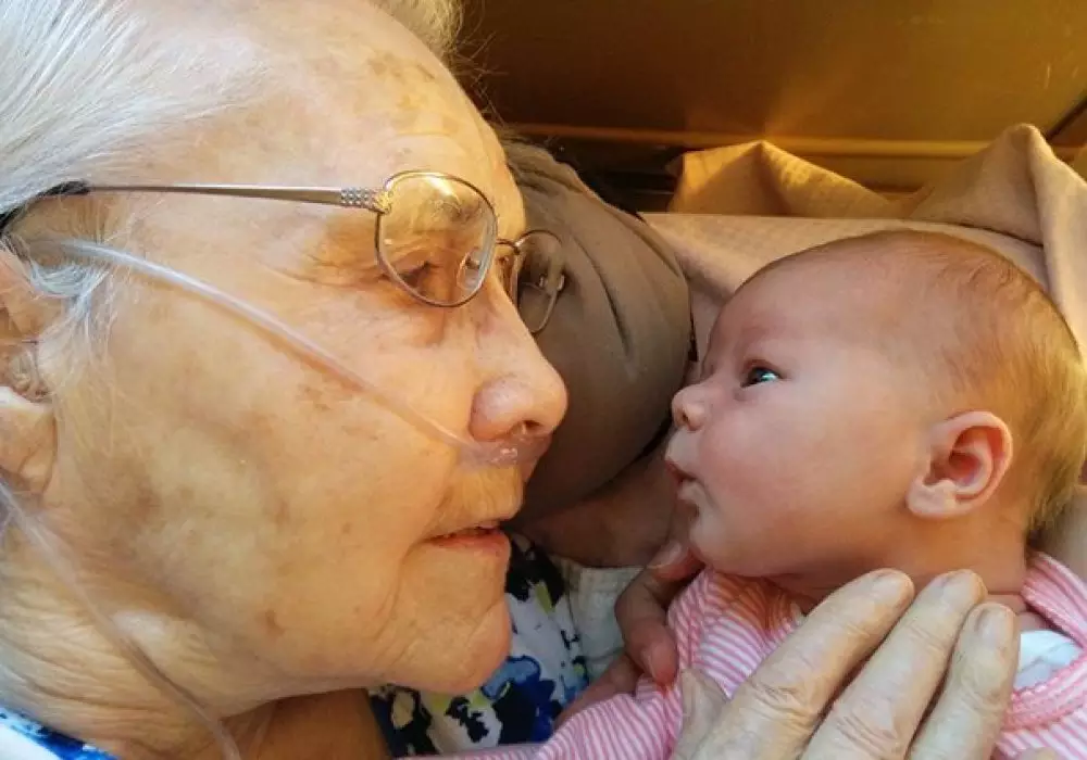 92-летняя женщина впервые видит свою правнучку, которой всего 2 дня от роду.