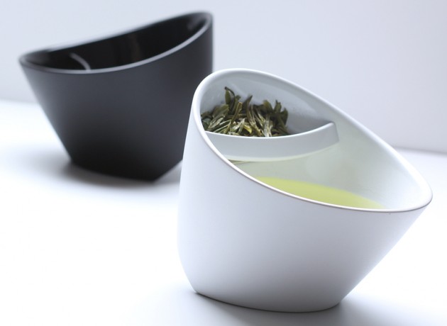 "Двойное" дно этой чашки позволяет легко заваривать листовой чай и пить его, не процеживая. Когда нужно заварить чай, в меньшую емкость насыпается заварка, а в большую емкость для воды наливается кипяток, после чего чашка переваливается на одну сторону.