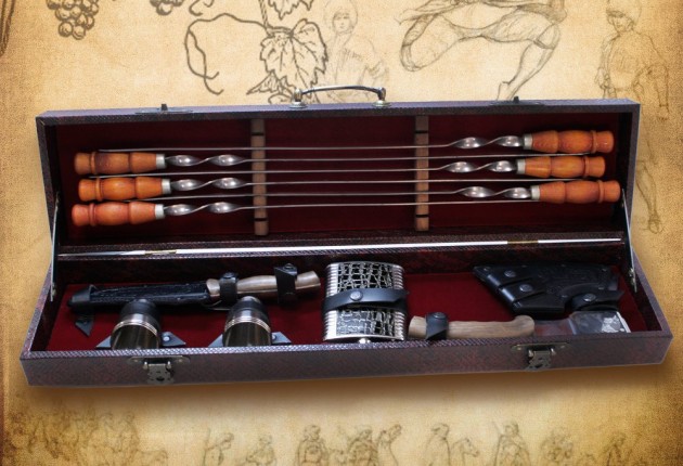 Набор "Кавказ" российского производства - для тех, кто обожает шашлыки, любит их готовить, проводить время на природе и раскладывать все по полочкам.