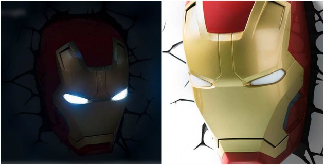 Эти светильники как будто врезались в стену и пробили ее. Притом некоторые из них, вроде мяча для футбола или молота Тора, врезались внутри комнаты, а другие - маска Железного человека, кулак Халка или передняя часть желтой машины - явно снаружи.