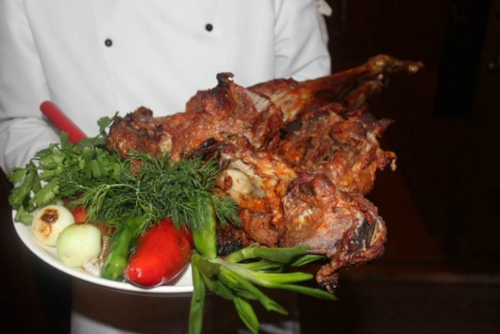 Это блюдо для особых гостей. Считается хорошей альтернативой обычному бешбармаку. Готовится из бараньего мяса в бараньем же желудке. Свое название берет от названия составных частей блюда: головы (бас) и желудка (карын). Мясо и предварительно отваренная голова закладываются в желудок и готовятся несколько часов на углях в собственном соку. Можно добавить лук, болгарский перец и картофель. Хватает такого бас-карына на 6 человек.