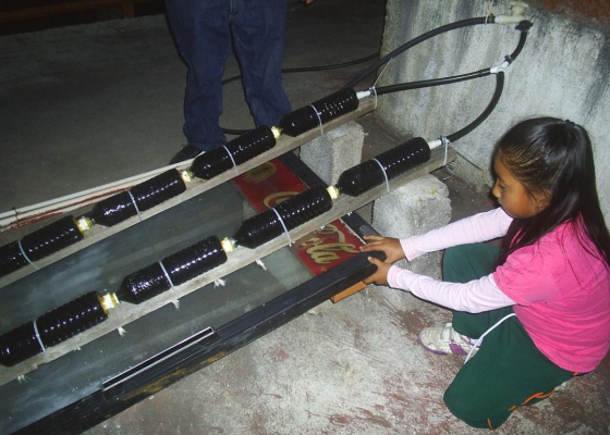 Вместе со своим отцом школьница изобрела нагреватель для воды. Он работает за счет солнечной энергии и сделан полностью из подручных материалов: пластиковых бутылок, шланга, деревянных брусков и стеклянной дверцы старого холодильника.