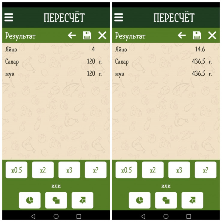 "Я люблю готовить по рецептам и часто сталкиваюсь с тем, что надо изменить рецепт под себя. Или форма в рецепте указана маленькая, а у меня в наличии только большая. Или у меня творога на 50 граммов больше, чем в рецепте запеканки. И вот, в очередной раз пересчитывая с шести пирожков на 20, я задумалась, что было бы неплохо иметь какое-нибудь приложение, которое упрощало бы этот процесс. Быстрые поиски не дали ничего, что меня бы устроило, и так как "яжпрограммист", то я решила такое приложение написать. Полтора месяца после работы я писала код, рисовала картинки и в какой-то момент подумала, что оно может пригодиться не только мне", - пишет автор.