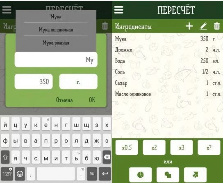 И последнее - увеличение массы одного ингредиента из списка. Например, у вас мяса в фарше больше на 100 граммов, чем написано в рецепте, а вам надо понять, сколько нужно добавить соли и специй. Просто увеличьте массу на сто граммов, программа сама пересчитает все остальное.