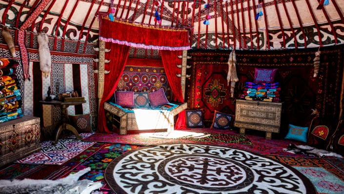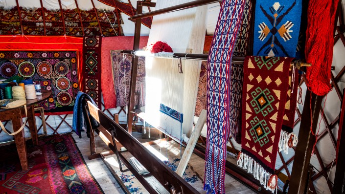 Мастер занимается созданием юрт, шьет корпешки, изготавливает сундуки и ткет ковры.