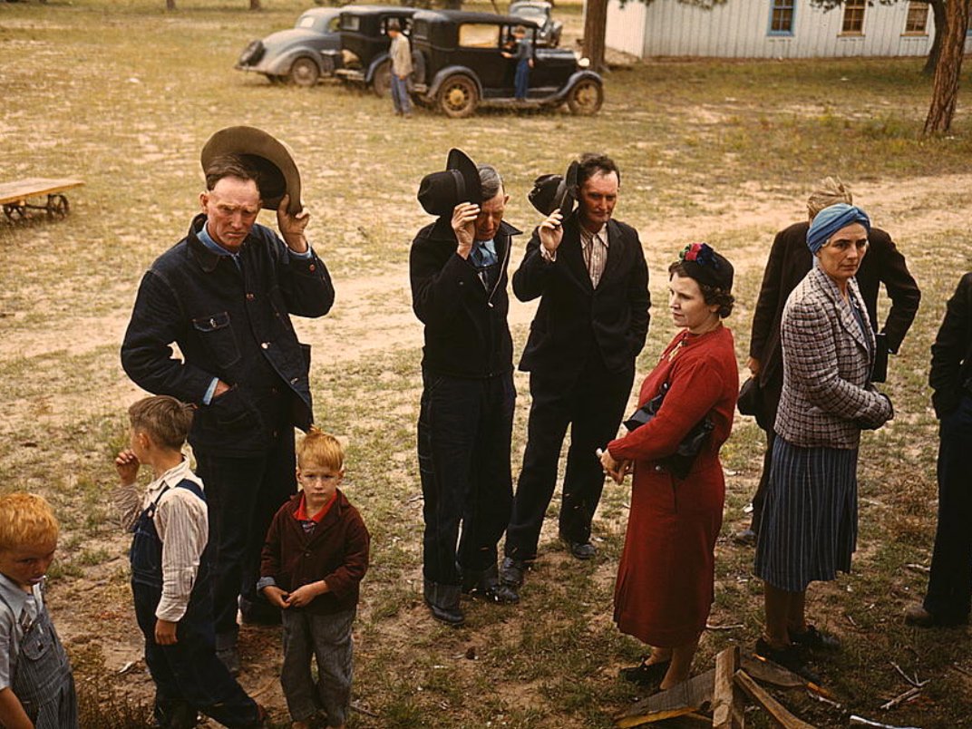 Молитва перед обедом на ярмарке, Пай-Таун, штат Нью-Мексико, октябрь 1940 года. Фотограф Ли Рассел (1903-1986)