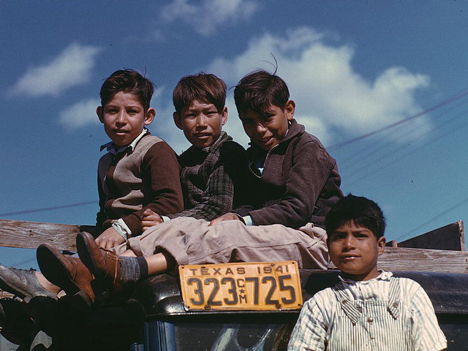 Дети, сидящие на машине. Фотография сделана рядом с трудовым лагерем министерства сельского хозяйства около Робстона, штат Техас, январь 1940 года.