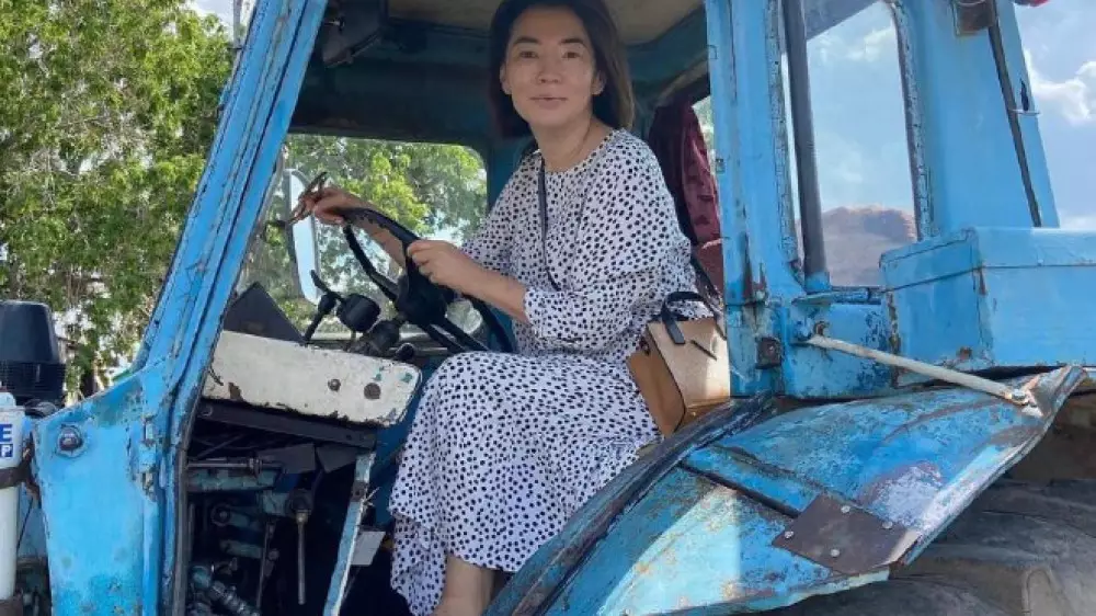 Как сообщила Айгуль Мукей, кадры были сделаны во время поездки к родственникам. В красивом платье она позирует в тракторе и на его фоне.