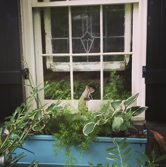 Теперь вот уже восемь лет она приходит к ним в гости едва ли не каждый день. Белка ждет друзей у порога дома, а иногда забирается на окно столовой, чтобы ее увидели.