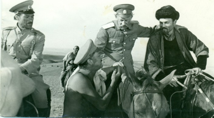 Слева направо: Актер театра им. Лермонтова, стоит В. Сошальский, на лошадях Е. Евстигнеев, Т. Жаманкулов. Алма-Атинская область, 1977 год. Фото из семейного архива С. К. Журабаевой и И. И. Карсакбаева
