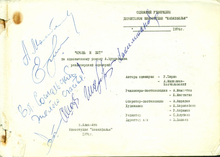 Титульный лист рабочего сценария фильма "Кровь и пот" с автографами актерского состава. Фото из семейного архива С. К. Журабаевой и И. И. Карсакбаева