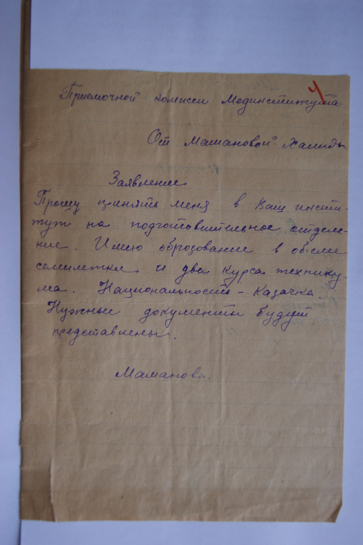 "В середине зимы, когда училась на первом курсе техникума, меня вызвали в обком партии. Я догадалась, по какому делу: когда зашла в кабинет, со мной поздоровались, посадили на диван. Началась беседа с вопросов: "Кем был отец, где жила, где была?". И я, не слушая наставления моих родных скрыть свое происхождение, честно рассказала все, что знала о семье. В результате меня исключили из рядов комсомола, но оставили учиться в техникуме. После этого ко мне окружающие стали относиться холодно, даже стипендию, которую получала по успеваемости, снизили до единовременного пособия", - рассказывала Маманова.