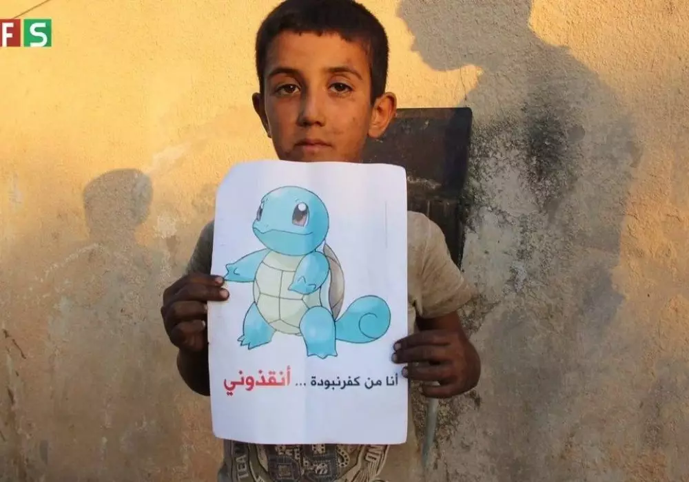 На плакатах написано: "Есть много покемонов в Сирии, приди и спаси меня", "Я покемон из Идлиба, приди и спаси меня".