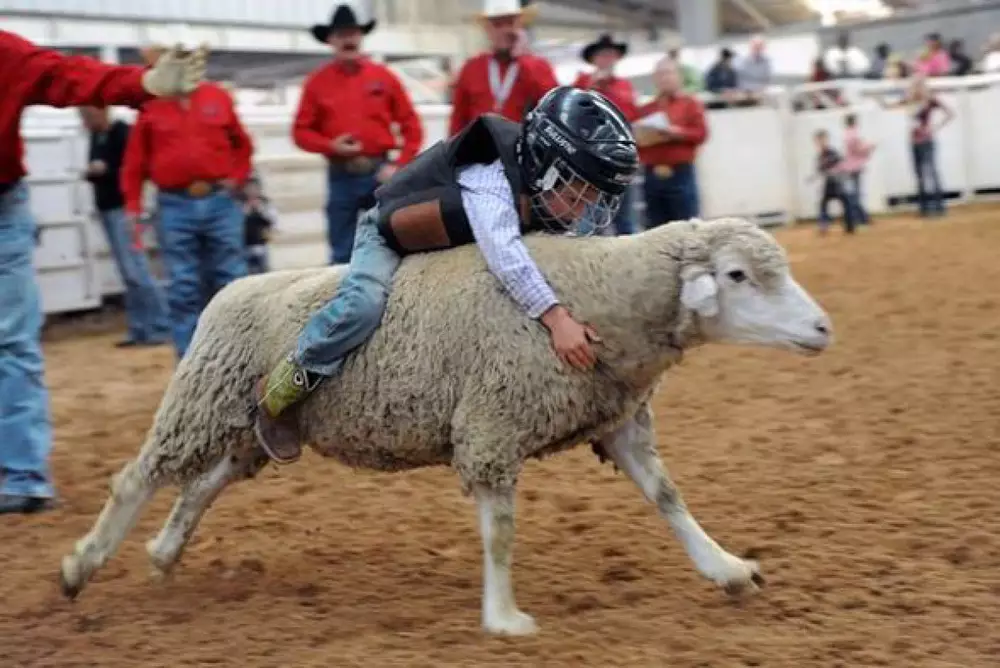 На фотографиях видно, как малолетние наездники изо всех сил пытаются удержаться верхом на овцах, однако мало кому это удается - большинство участников заездов падают спустя несколько секунд. Отметим, что по правилам этого необычного родео дети обязаны надевать шлемы и защитные жилетки. Также существуют ограничения по возрасту, росту и весу участников. Тем, кто продержится верхом на овце дольше всех, дают небольшие призы.