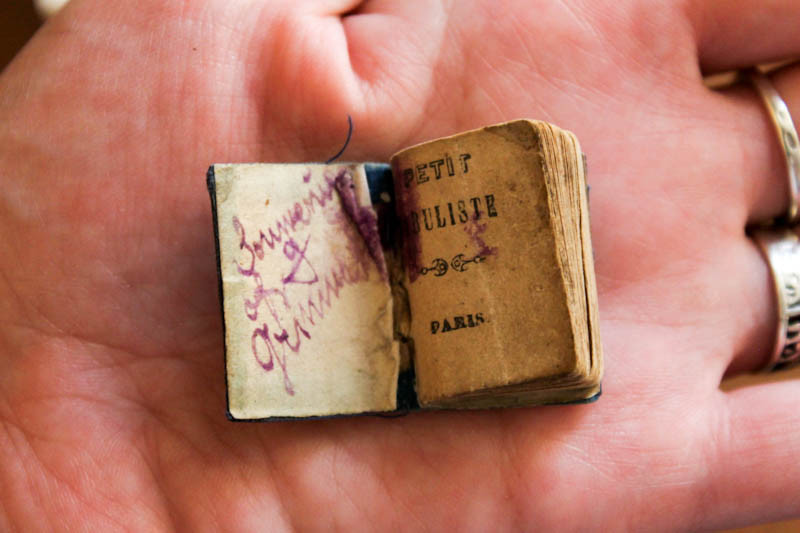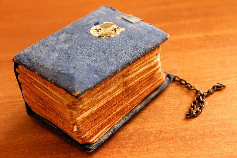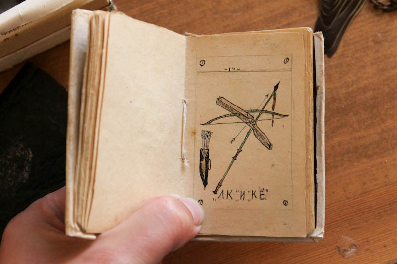 Например, вот такая толстенькая книжечка в половину ладони величиной. Папа до сих пор переплетает себе дневники.
