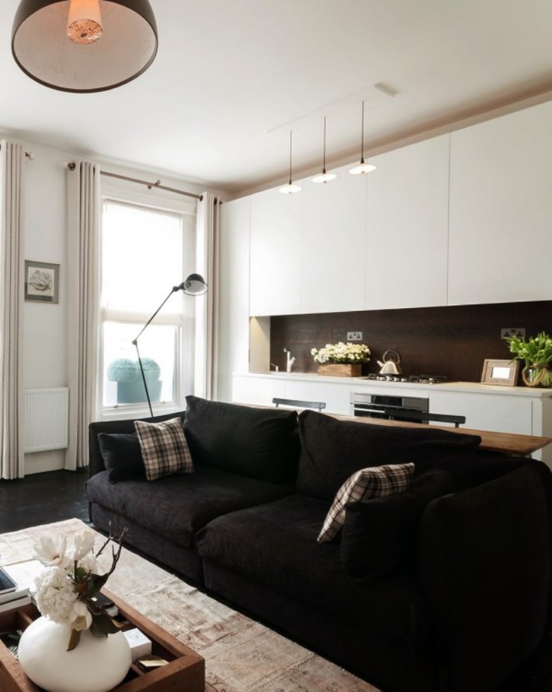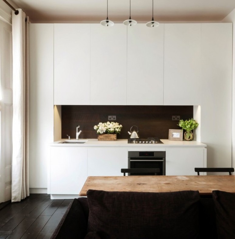 Обеденный стол придвинут вплотную к спинке дивана для экономии места. Белая кухня сливается по цвету на бледной стене, однако плинтус был изготовлен цвета темного дерева для облагораживания всего интерьера.