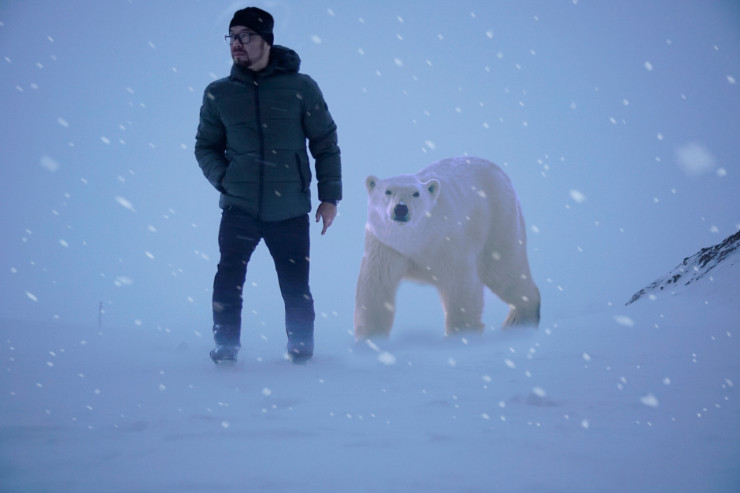 "Я сфотографировал себя в степи, была снежная мгла, ничего не видно. А потом появились пингвины, белый медведь и другие персонажи", - сказал он.