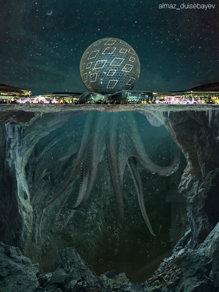 "Я видел подобные иллюстрации на зарубежных сайтах. И у меня возникла идея придумать что-то похожее с нашими зданиями. Так как Нур-Султан известен своими необычными и интересными архитектурными решениями, я решил создать с помощью Photoshop "новую подземную реальность" столичных объектов", - рассказал Алмаз Дуйсебаев.