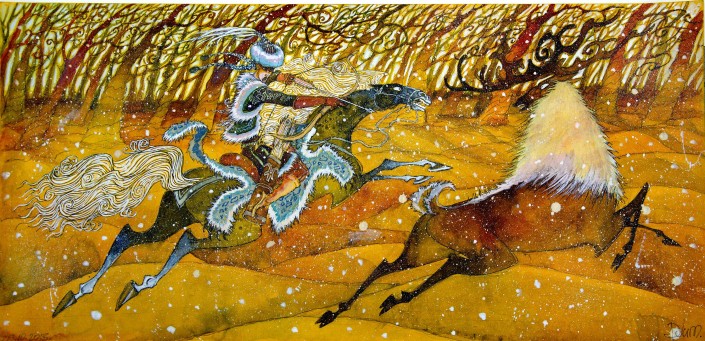Этническое направление Бейшебаев тоже выбрал неспроста: в детстве он рос в окружении чабанов и табунщиков. "Наверное, это дано мне на генетическом уровне", - сказал он. Во всех персонажах художника невооруженным взглядом видна некая сила. В том числе и в женских образах. Восточные девушки Джум Гунна не покладистые и мягкие, а запросто могут оседлать скакуна или бегать по полям.