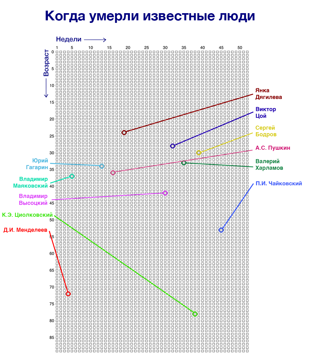 Получается полная карта всей вашей жизни размером с лист А4, которая дает наглядное представление о конечности вашей жизни и поможет ценить каждую ее неделю. Вы, вероятно, хотите спросить, где же на этом календаре дни недели, числа и месяцы?