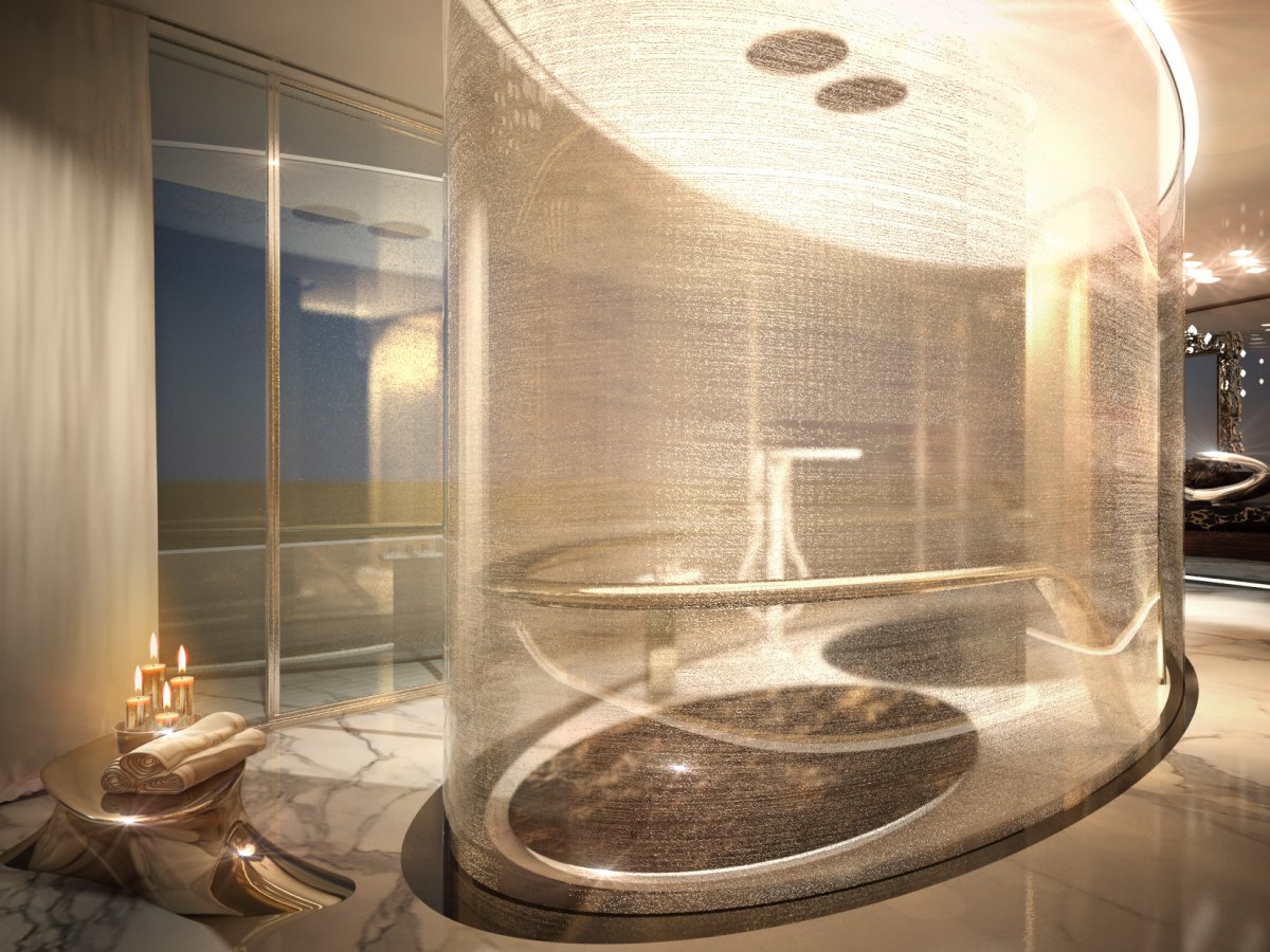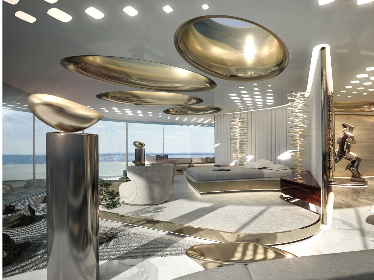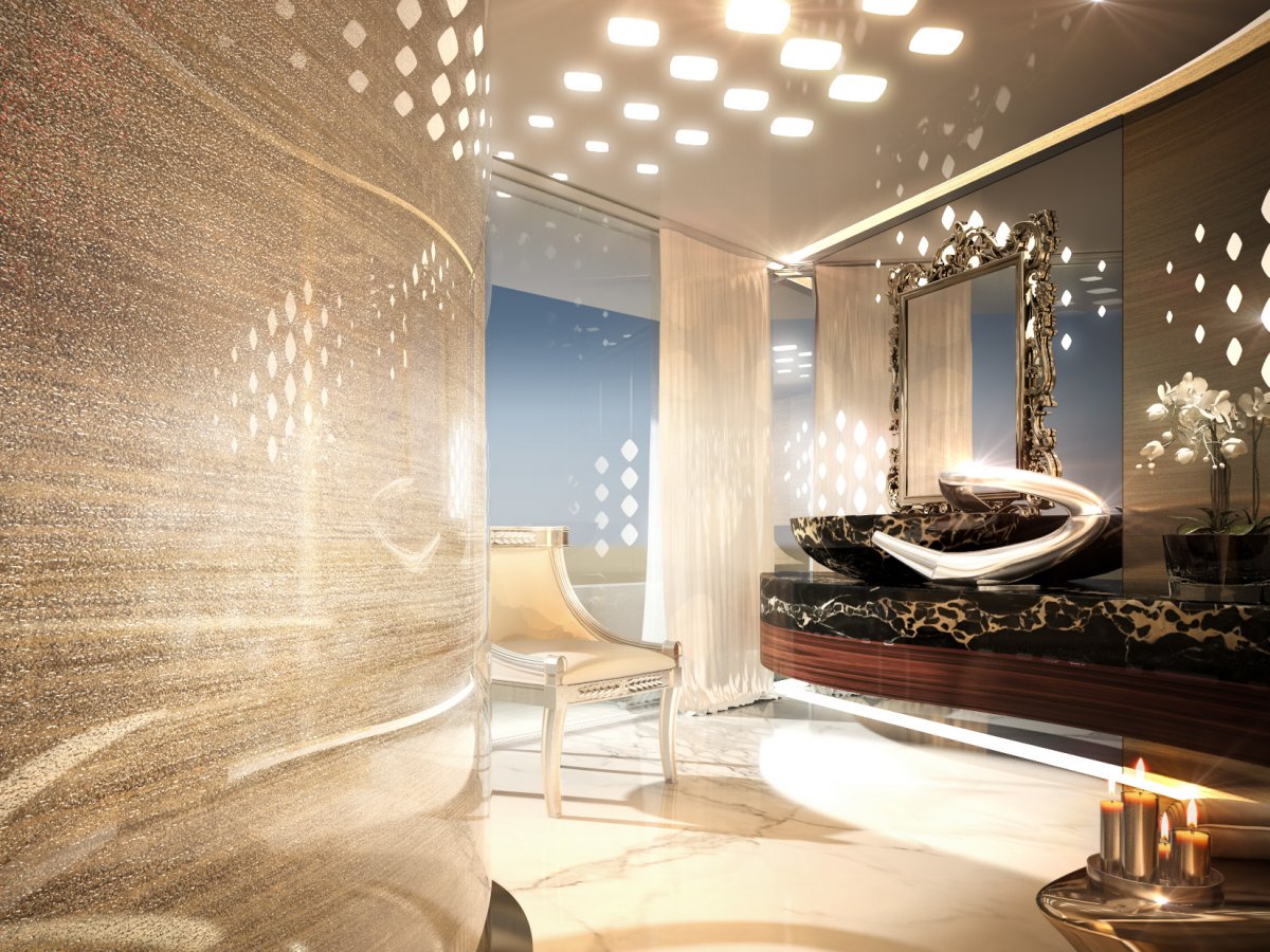 Каюты оформлены в эклектичном стиле, но в окончательном варианте яхты, возможно, будут изменения.