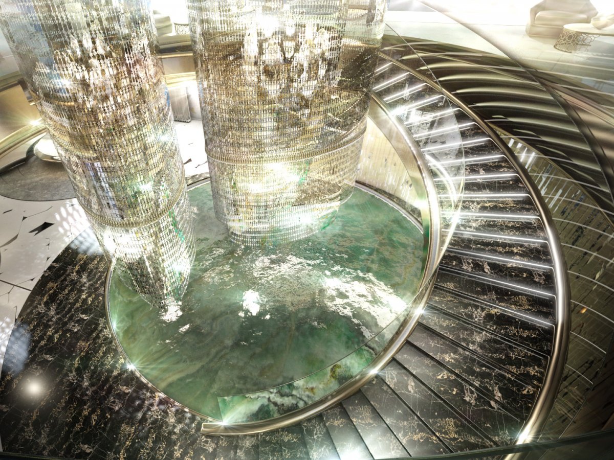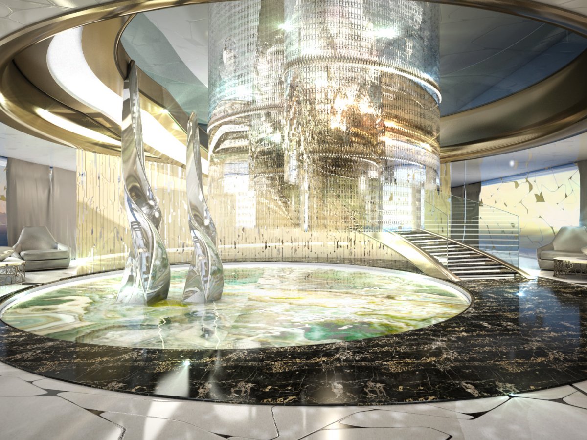 Сверкающая люстра проходит сквозь палубы и заканчивается над внутренним бассейном, из которого стремятся ввысь стеклянные скульптуры.