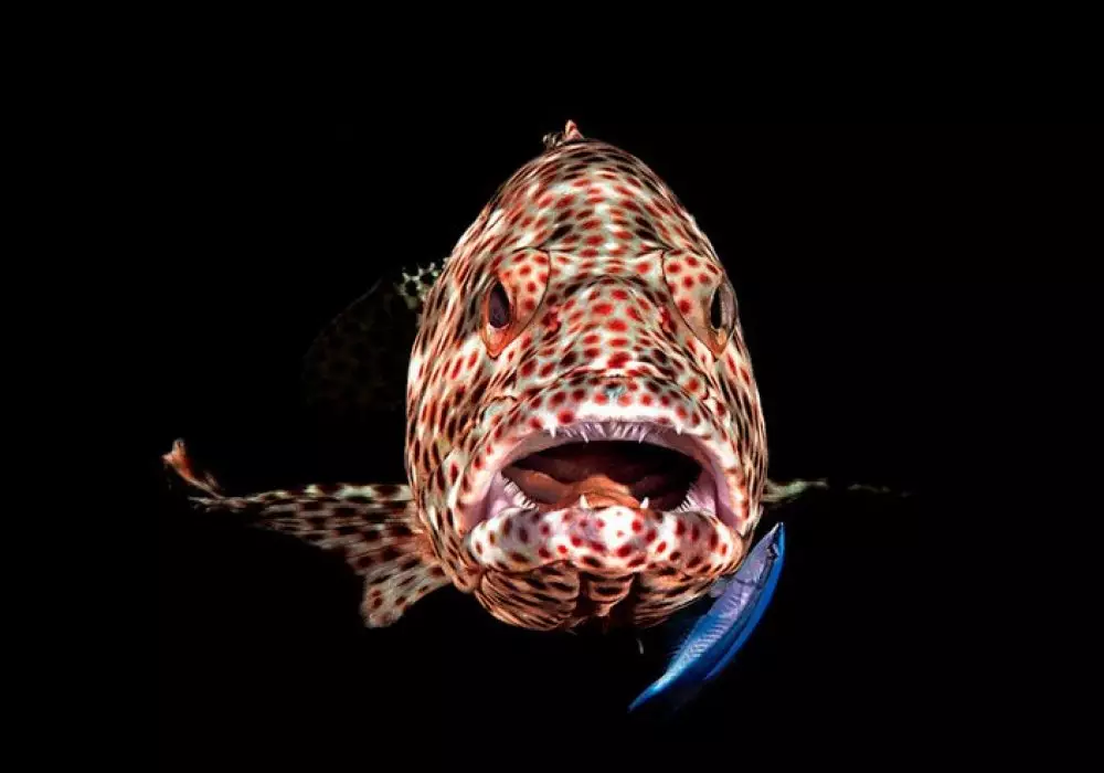 Большеротый групер, или просто гигантский окунь. У автора фото Ференца Лоринча (Ferenc Lorincz) - первое место в номинации "Компактная камера, поведение морских обитателей".