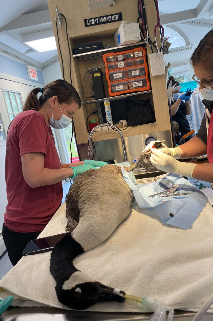 Как только гусь очнулся от наркоза, а рана была закрыта и перевязана, сотрудники переместили Арнольда к открытой двери, чтобы он смог увидеть свою возлюбленную.