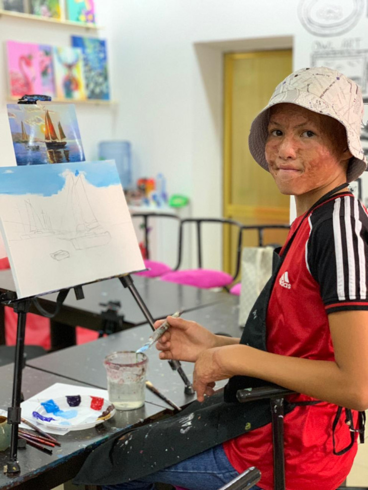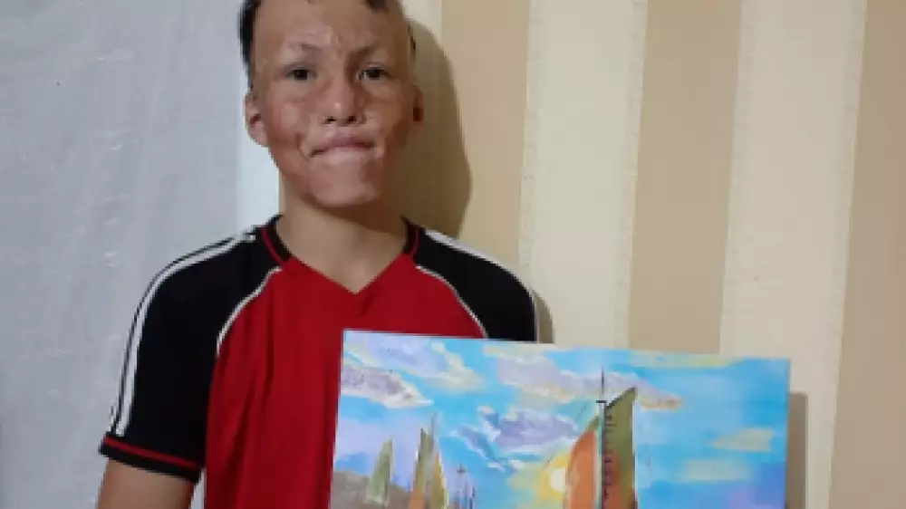"Видя, как мой ребенок талантливо рисует, волонтеры предложили продавать его картины. Мы никогда об этом не задумывались, но у сына загорелись глаза от той мысли, что он сам сможет зарабатывать на свою операцию. Он сказал: "Буду копить на новое лицо". Учитывая расходы на материалы, предложили за работу 10 тысяч тенге. У нас уже забрали два пейзажа, готовы еще две картины.
