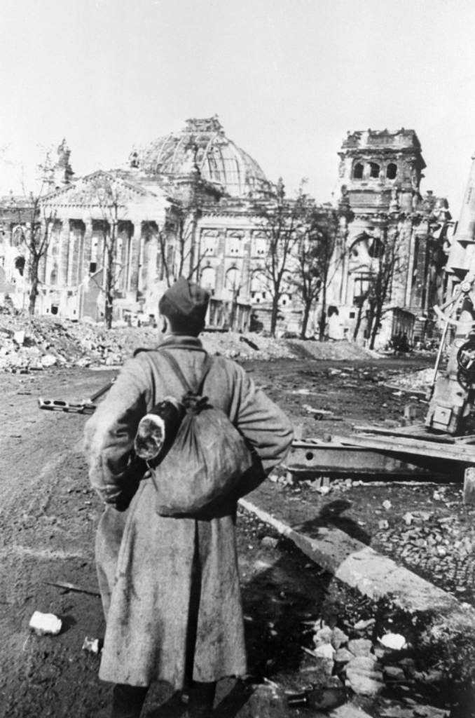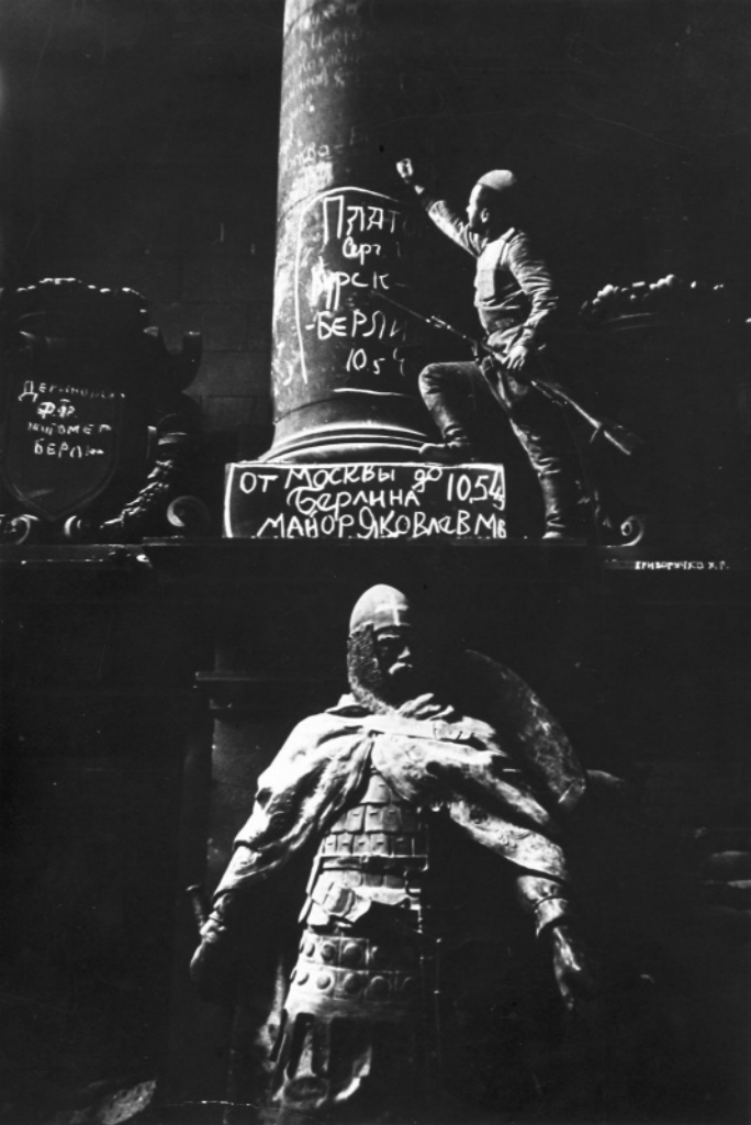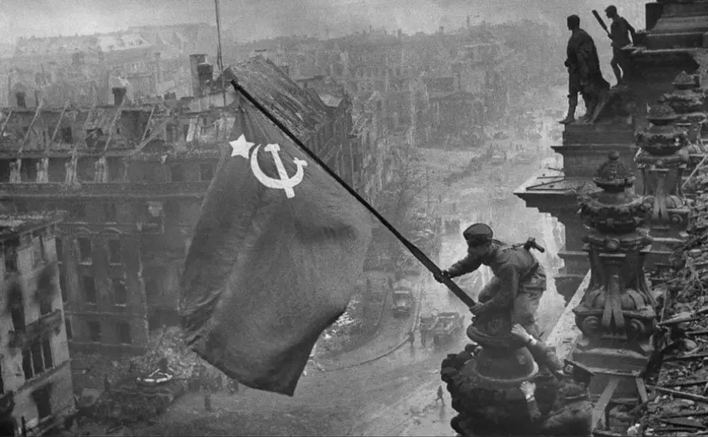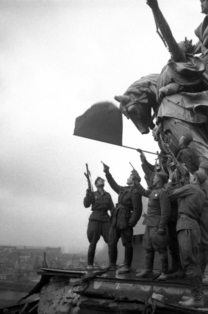 Знамя Победы над Рейхстагом. Знаменитая фотография Евгения Халдея. Когда фотокорреспондент добрался до Рейхстага, флагов было установлено уже очень много. Наткнувшись на нескольких бойцов, он достал свой флаг и попросил их помочь забраться на крышу. Так и получился этот снимок.
