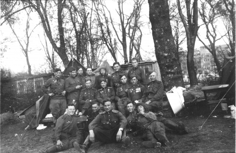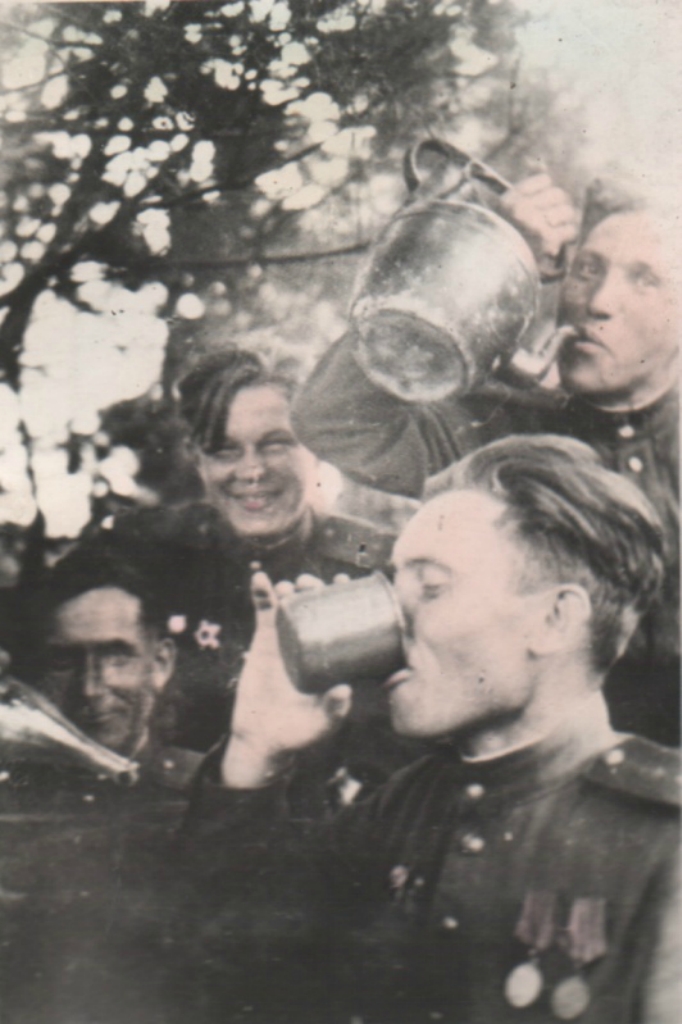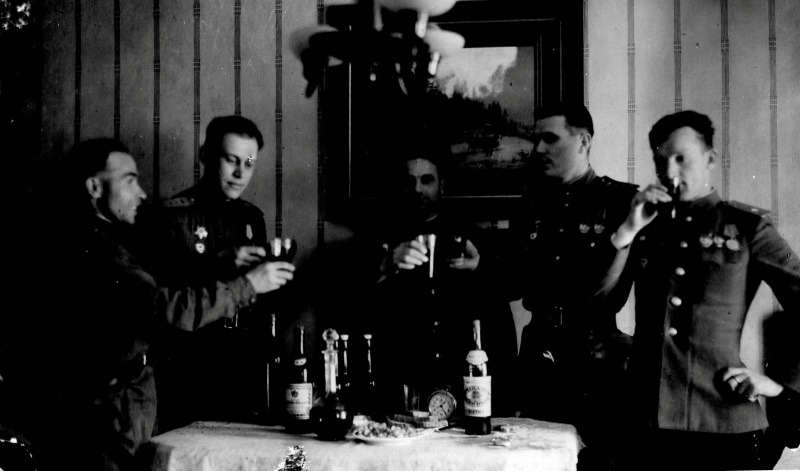 Советские офицеры В.А. Верхоланцев, И.П. Лесной, Б.М. Авжиян с однополчанами празднуют Победу.