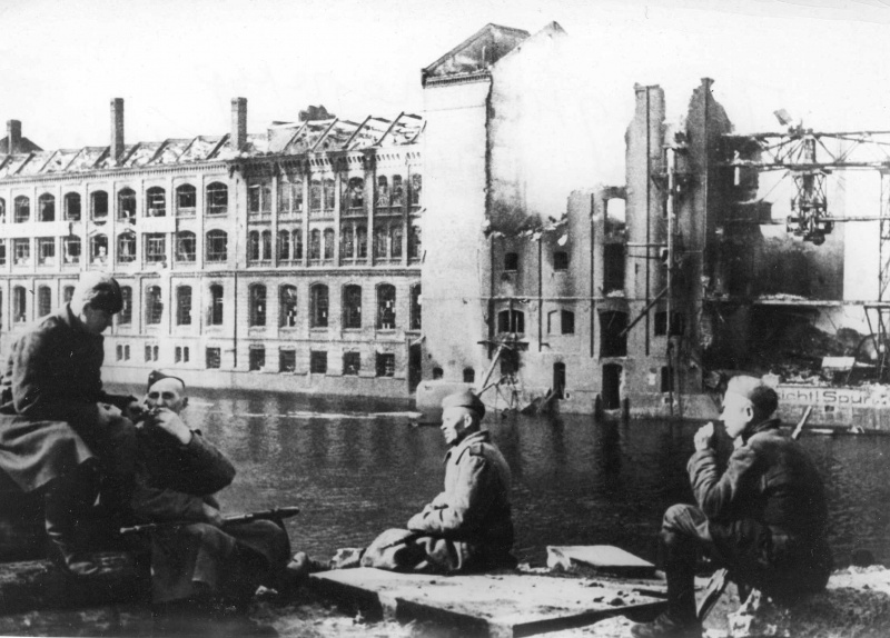 Советские солдаты отдыхают на берегу реки Шпрее в Берлине.
