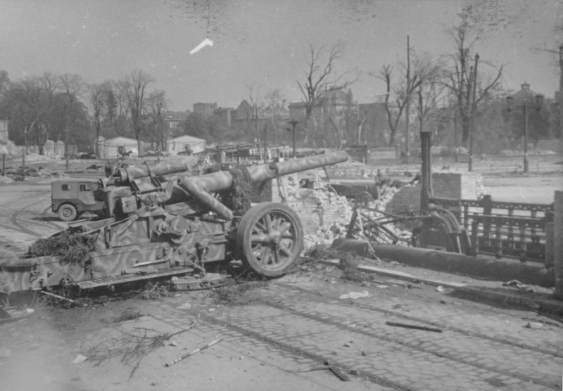 Брошенная на улице Берлина 210-мм немецкая тяжелая полевая гаубица Mrs.18.