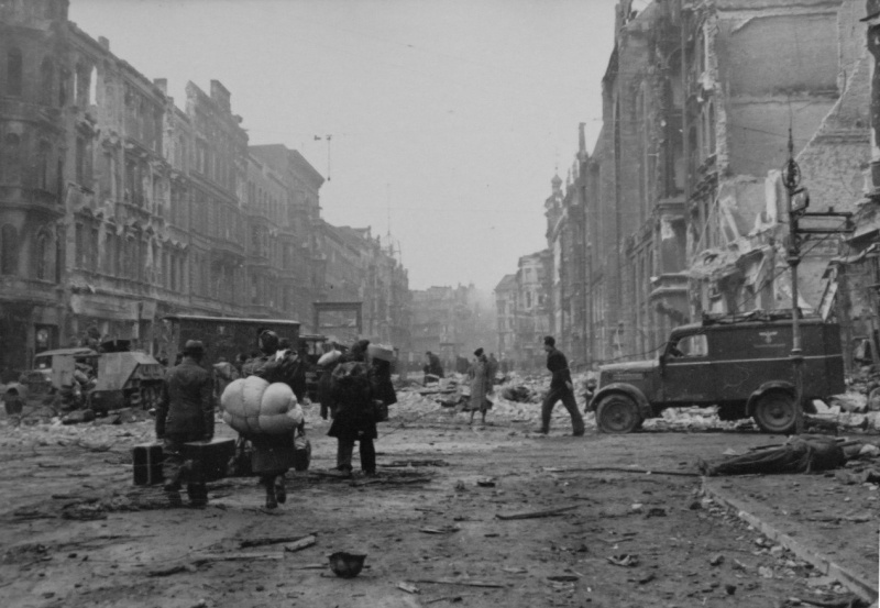 Немецкие мирные жители идут по разрушенной улице Берлина.