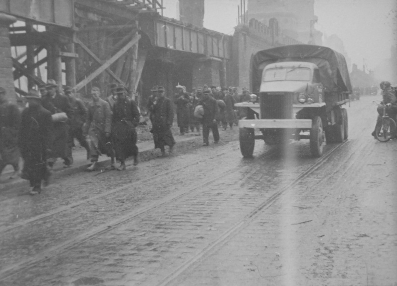 Американский грузовик "Студебеккер" проезжает по улице Берлина мимо колонны немецких пленных и мирных жителей.