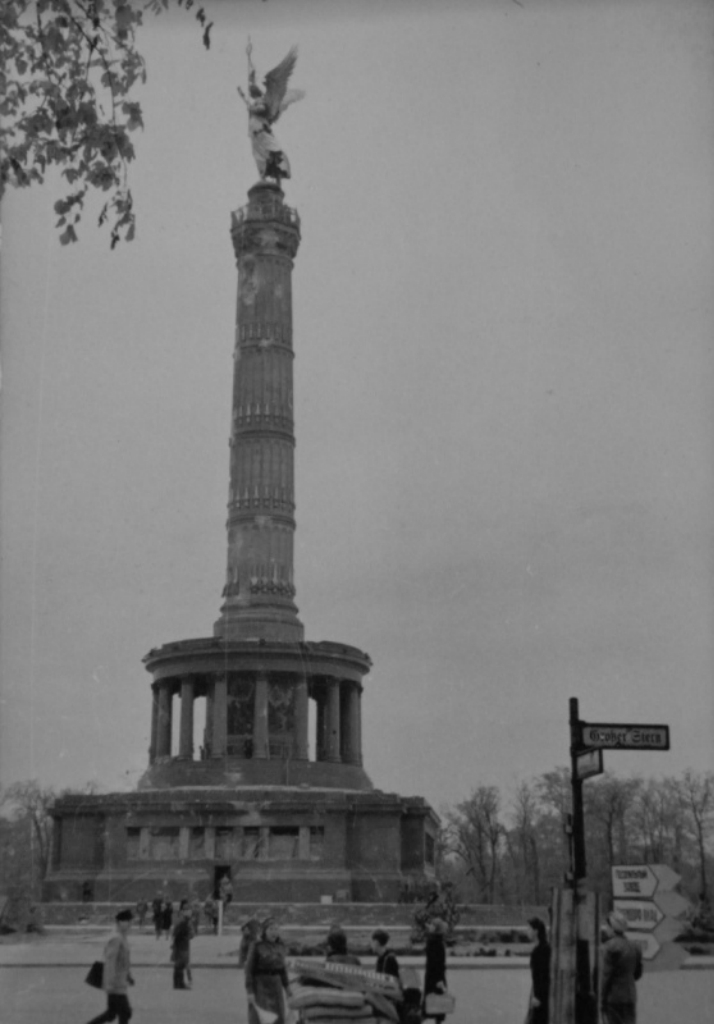 Советская регулировщица и немецкие мирные жители у колонны Победы (Siegessäule) в парке Тиргартен в Берлине.