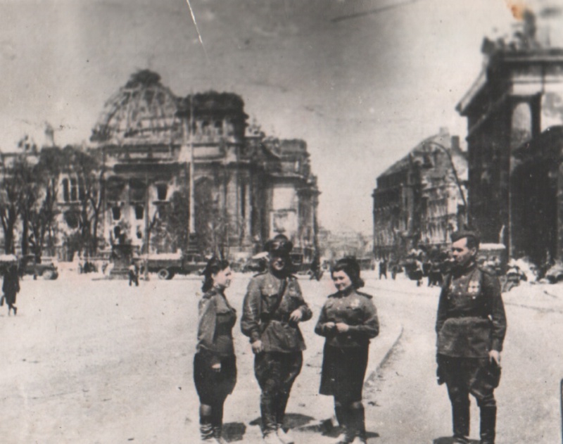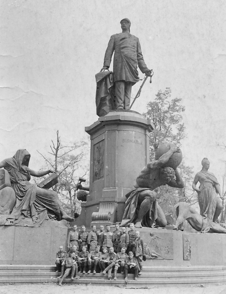 Военнослужащие 88-го отдельного гвардейского тяжелого танкового полка у памятника Бисмарку в Берлине.