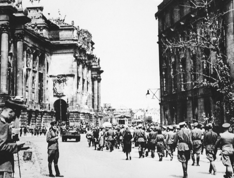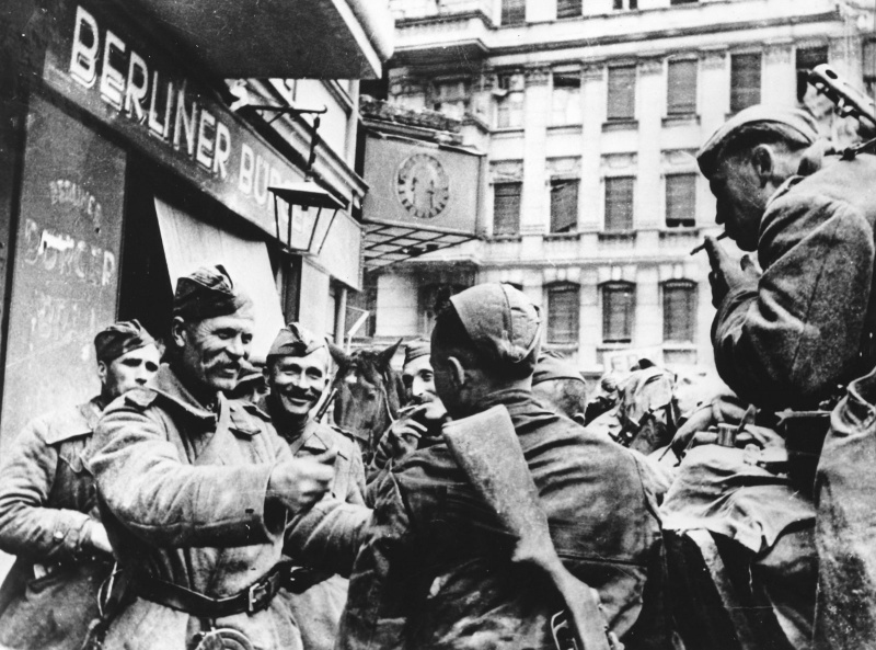 Первый день мира в Берлине. Советские солдаты общаются с мирными жителями.