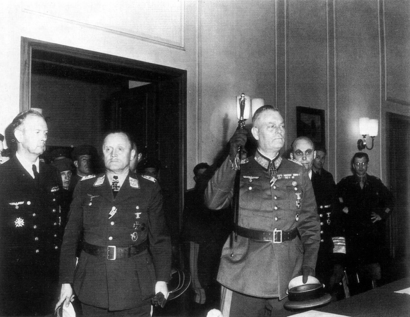 Представители германского командования во главе с генерал-фельдмаршалом Вильгельмом Кейтелем направляются на подписание Акта о безоговорочной капитуляции Германии.