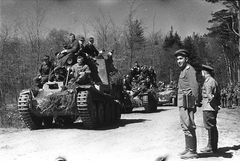 Офицеры 3-го Белорусского фронта принимают сдающихся в плен вместе с бронетехникой немцев.