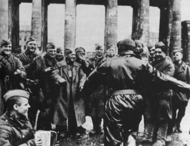 Советские бойцы аплодируют своему танцующему товарищу у Бранденбургских ворот в Берлине.