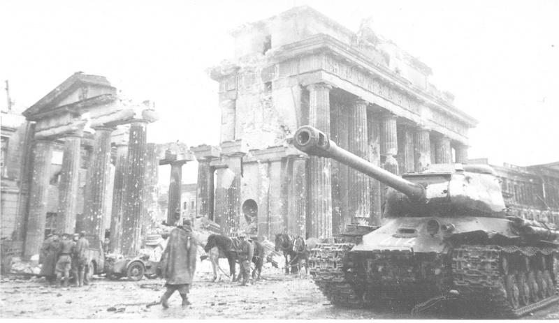 Танк ИС-2 7-й гвардейской тяжелой танковой бригады у Бранденбургских ворот.