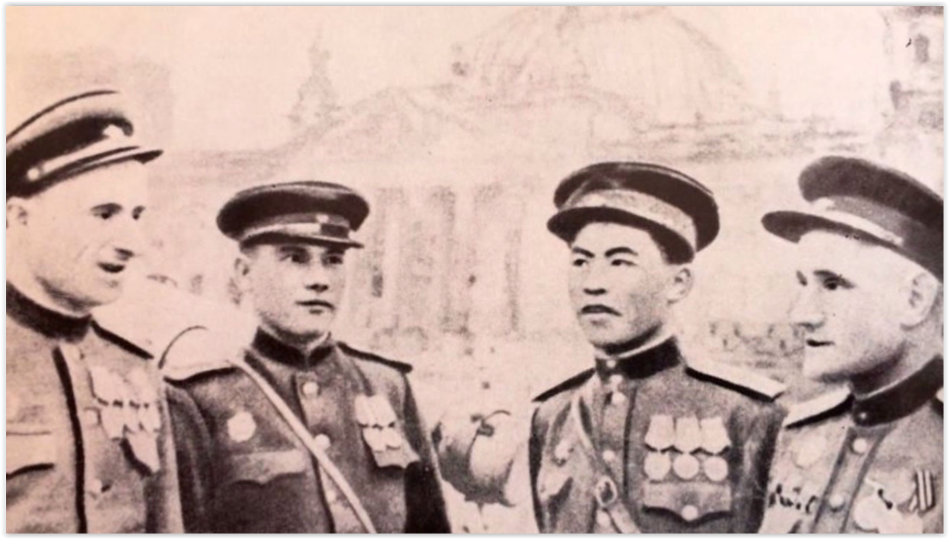 На фото слева - направо: младший сержант М. Кантария, сержант М. Егоров, лейтенант Рахымжан Кошкарбаев, капитан С. Неустроев.
