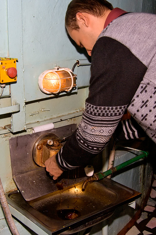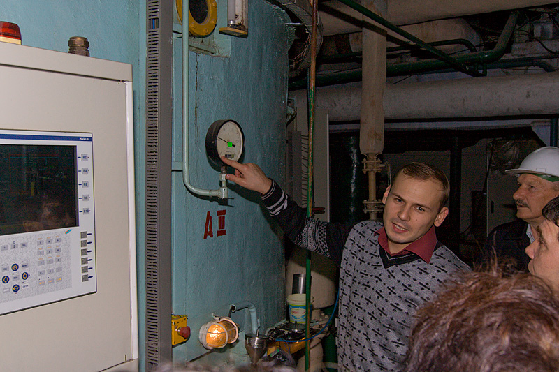 Полученный в итоге сок сгущают выпариванием. Полученный сироп вываривают до его кристаллизации. "Варка" сахара - важнейшая операция в приготовлении сладкого продукта. На фотографии - наш экскурсовод и главный технолог в пункте управления участком уваривания.
