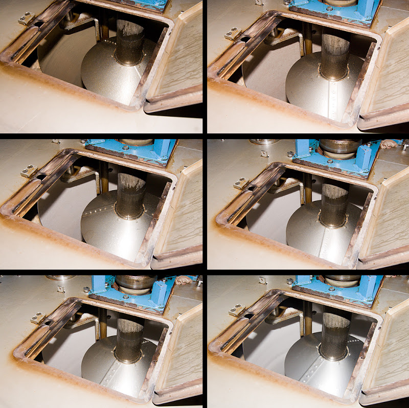 В центрифуге, из утфеля отделяется все лишнее и уходит в специальный сборник под установкой. А на стенках барабана остаются кристаллы сахара-песка. Следующие фотографии сделаны в течение одной минуты и на них отчетливо просматривается пробелка сахара.