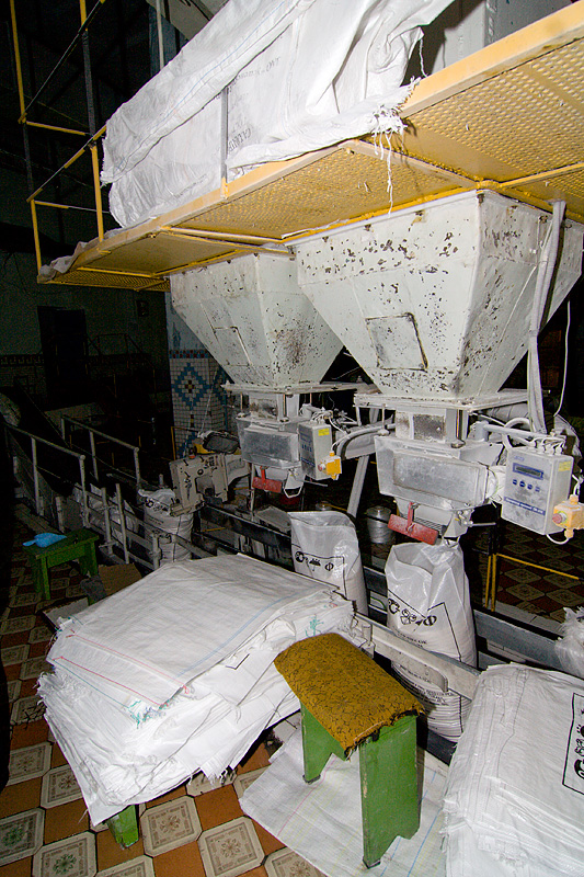 На фотографии полуавтоматические фасовочные бункеры, возле которых на лавках сидят упаковщицы. Из стопки берется мешок, надевается на горловину бункера, дозатор отсыпает в мешок 50 килограммов. После чего конвейерная лента сдвигается, горловина мешка попадает в "швейную машинку", которая прострачивает мешок и далее зашитый мешок по транспортерной ленте едет на склад.