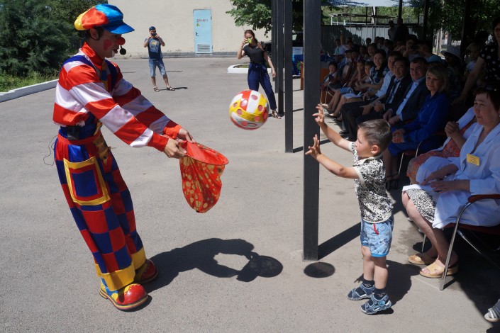 Дети с ограниченными возможностями играют с клоунами. Алатауский район Алматы.