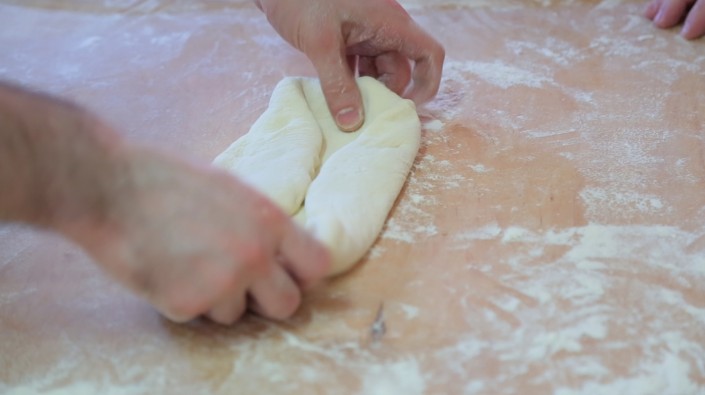 3. Посыпаем мукой место, где будем раскатывать тесто. "Раскатываем" заготовку пальцами. Нежно. С любовью. Оставляем небольшие борта.